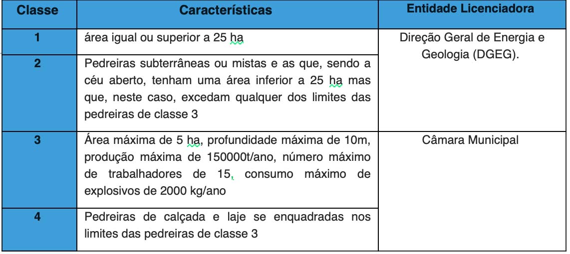 No quadro seguinte apresentam-se as características das classes de pedreiras e a correspondente entidade licenciadora: